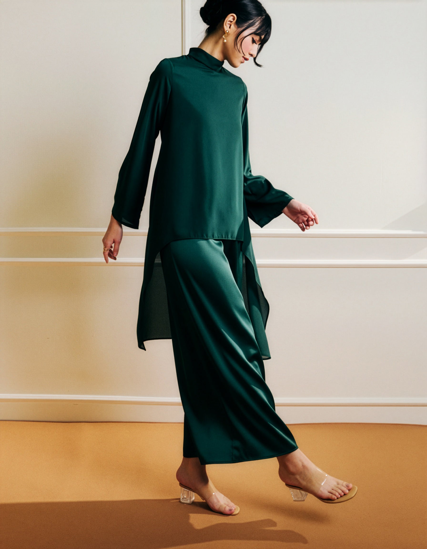 A smooth satin inner forms the foundation, draping fluidly against the body with a soft, luminous finish. The outer chiffon softens the silhouette, allowing the satin beneath to glow subtly through. The effect is fluid and dimensional — like petals caught mid-motion.